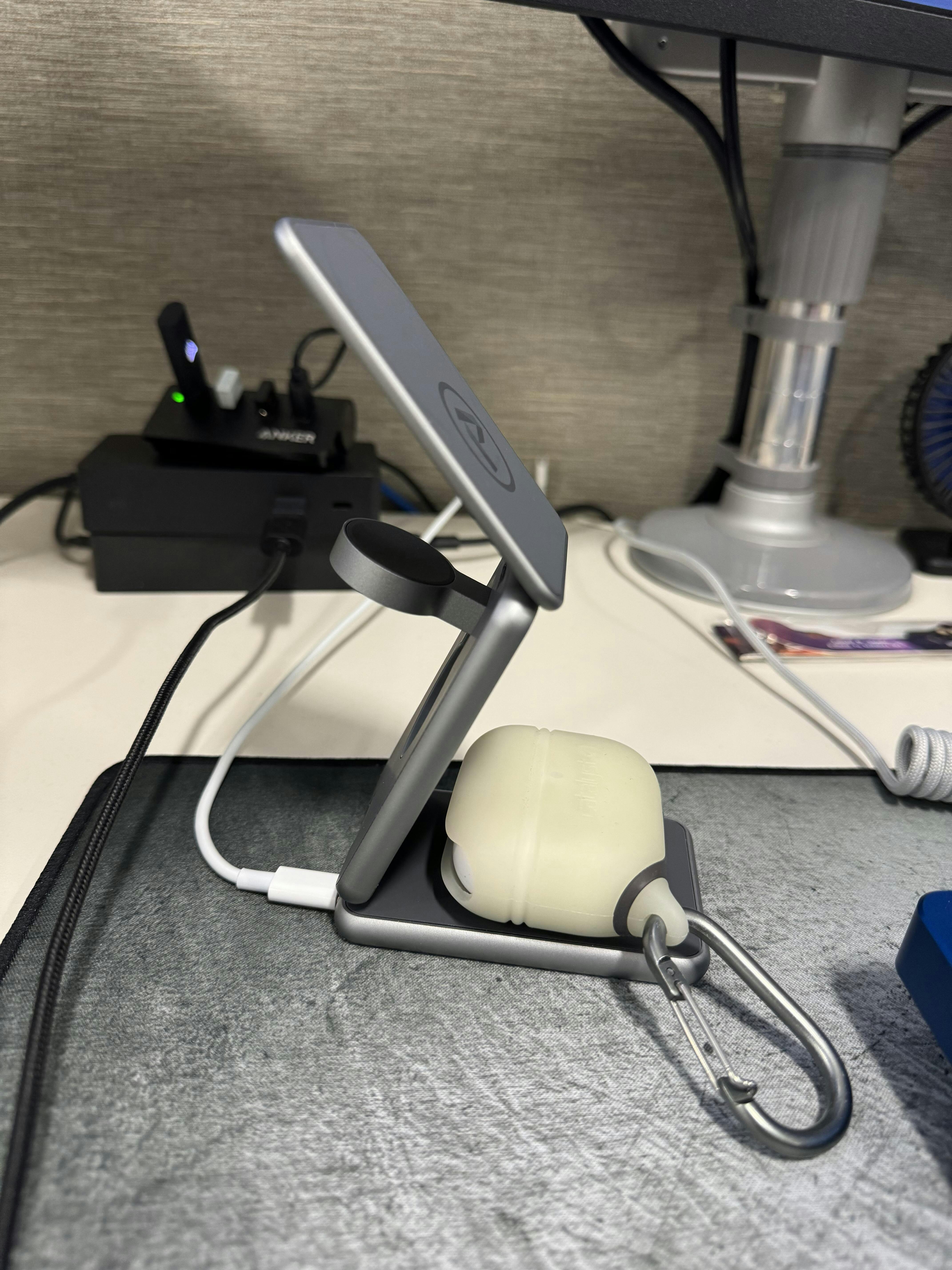 - Magnetic Charging: Securely charges an iPhone, earbuds, and smartwatch simultaneously.